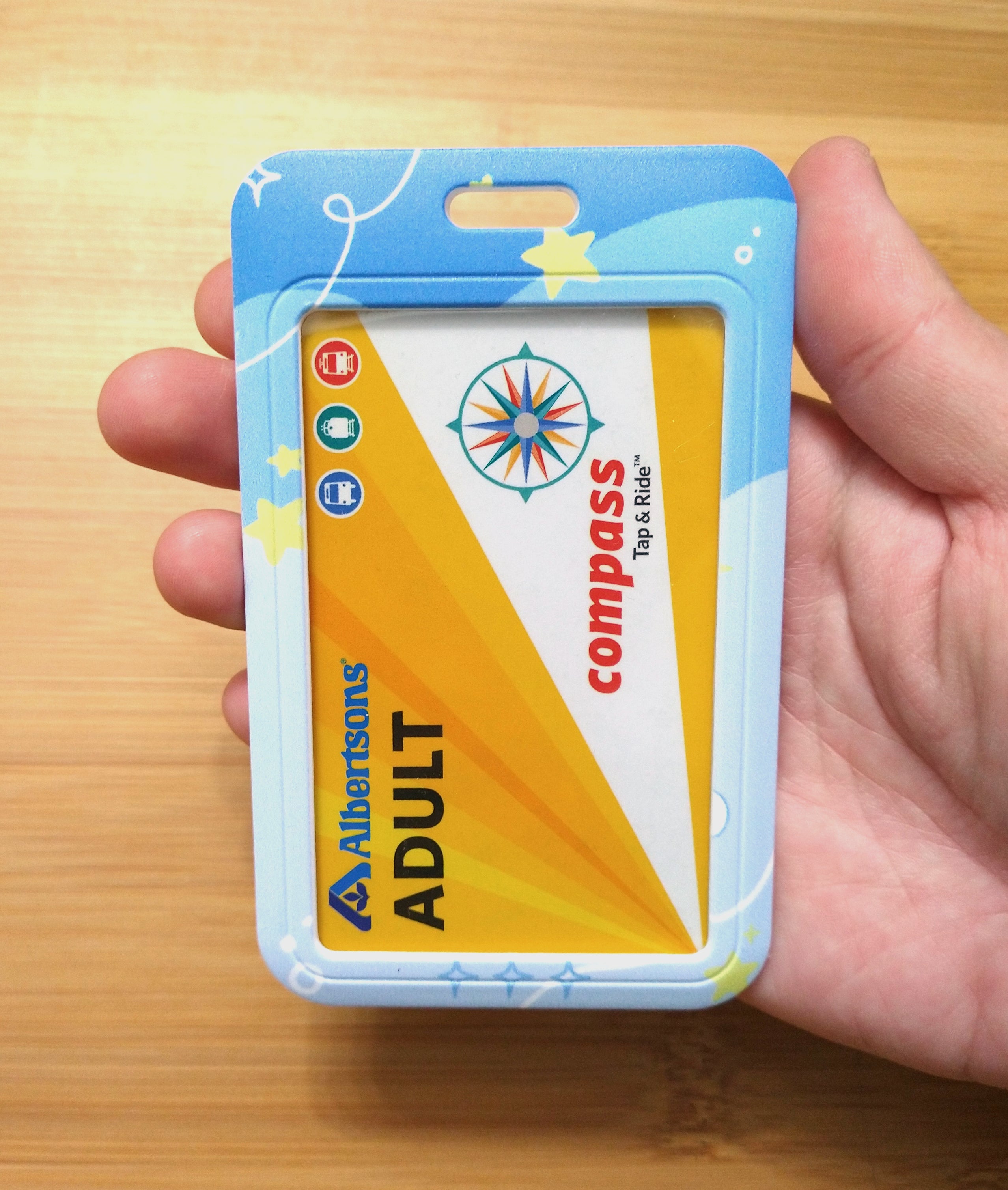The card holder can hold an ID, badge, bus pass, or anything else the size of a standard credit card (3.375 inches x 2.125 inches). A transparent window on the front displays the card. To insert or remove a card, slide the pieces apart as shown in the video~